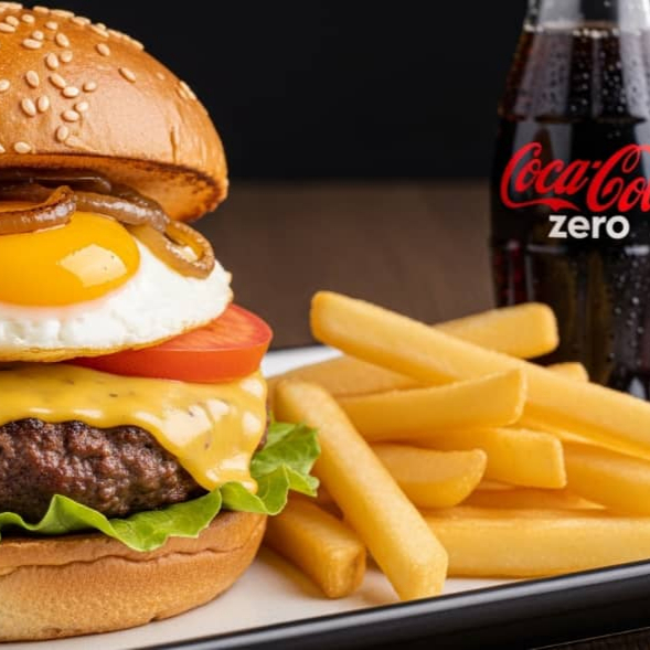 hamburguesa con 100gr de carne , huevo frito, tomate, lechuga, cebolla caramelizada, acompañada de papas fritas y cocacola zero mini