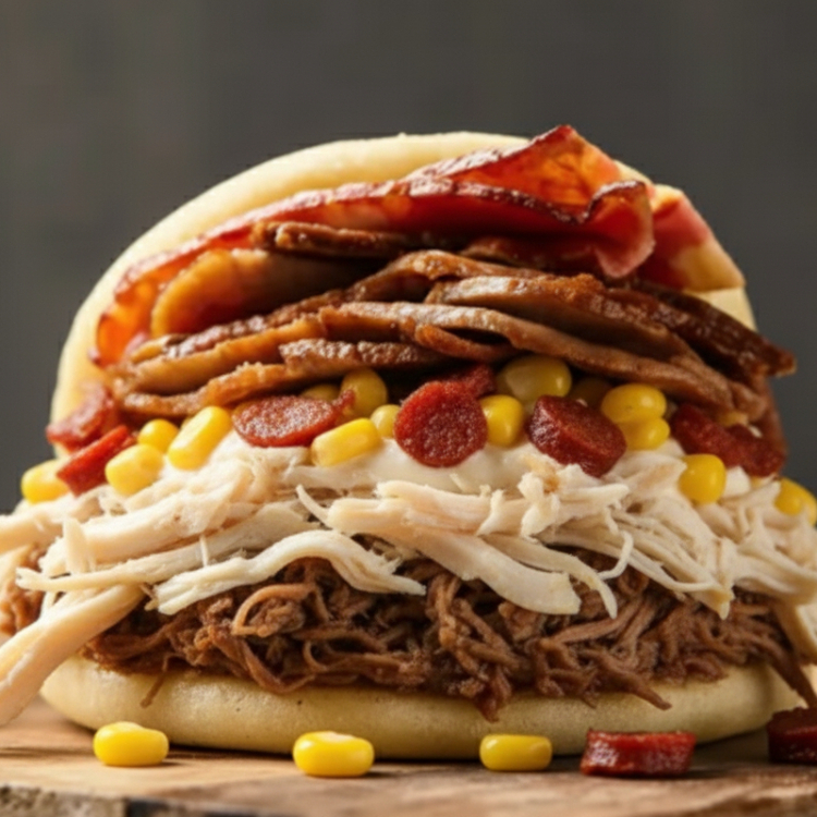 Rica Arepa con Mantequilla Rellena de Carne Desmechada, Maduritos y Queso Mozarella. (320g)