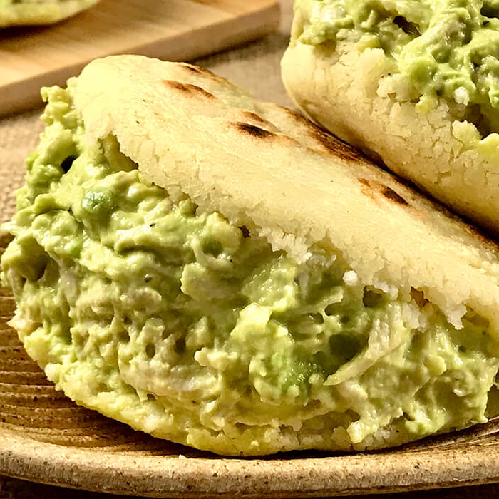 arepa rellena con pollo desmechado, aguacate, arvejas verdes, mantequilla y queso costeño