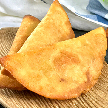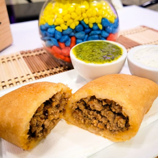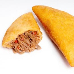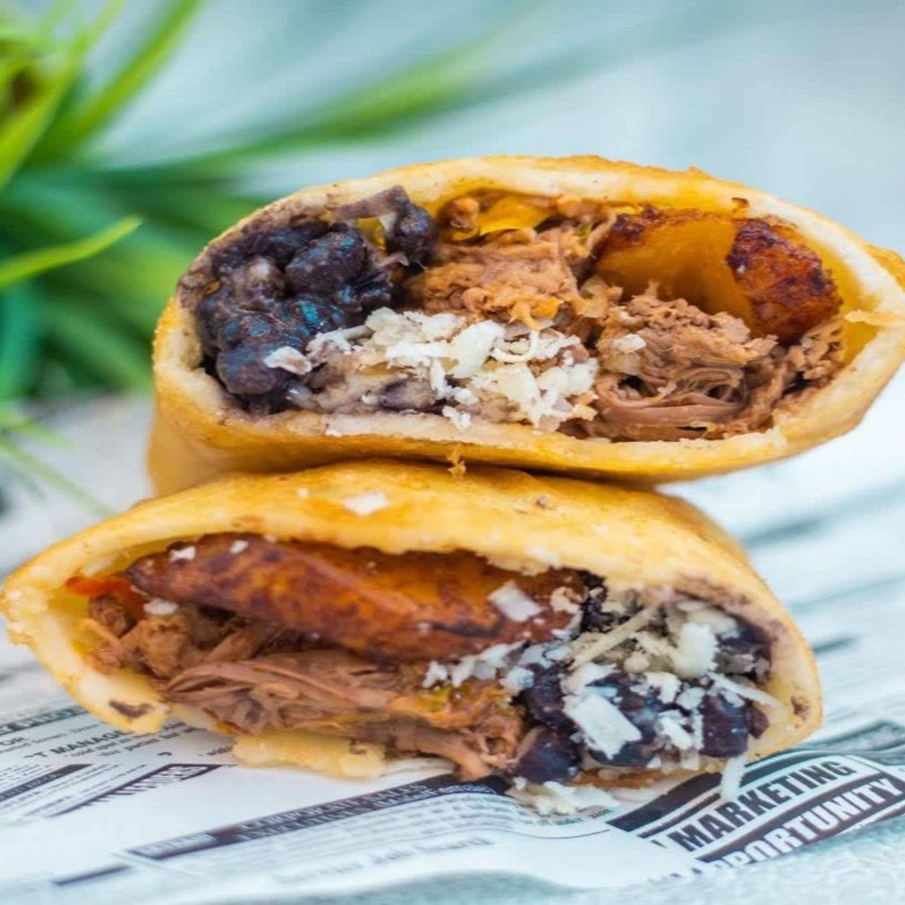 empanada rellena con queso costeño, carne desmechada, platano maduro frito y caraotas (frijol negro)