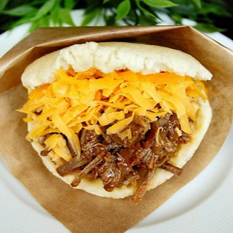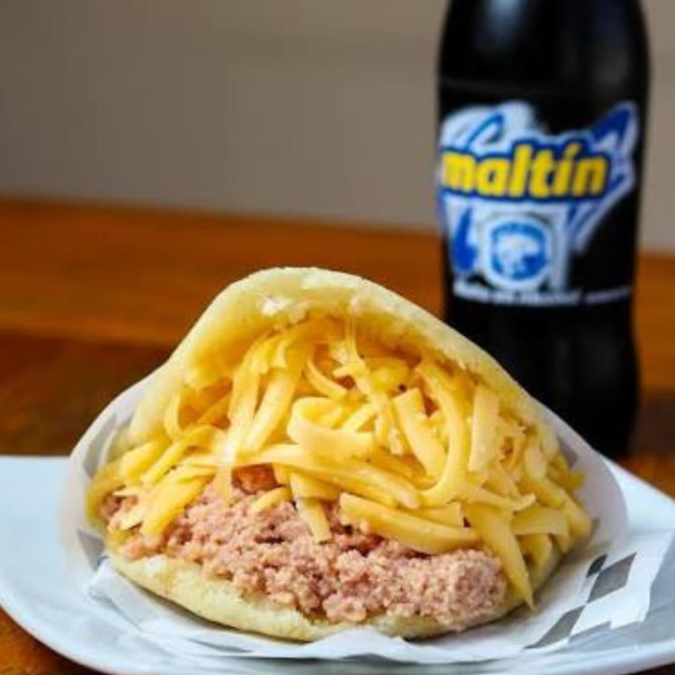 arepa rellena con carne desmechada, queso amarillo y mantequilla