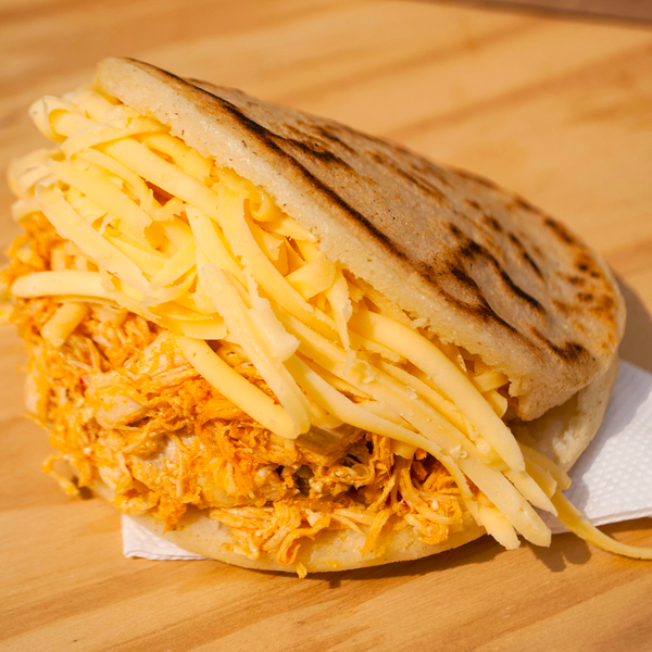arepa rellena con pollo desmechado, queso amarillo y mantequilla