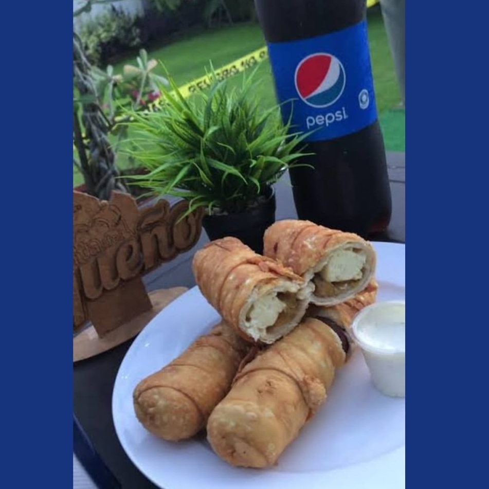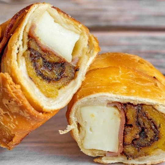 masa crujiente rellena con un bastón de queso costeño, jamón y plátano maduro frito