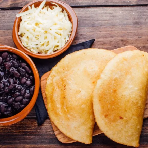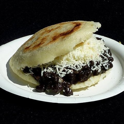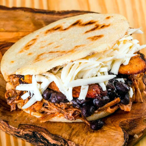 arepa rellena con queso costeño, carne desmechada, caraotas y platano maduro frito