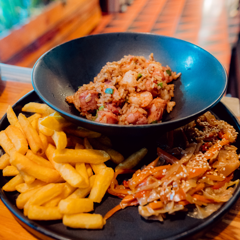 Wok de arroz, chorizo santa rosano, camarón precocido, salsa oriental, cebollín, salteado de vegetales, papas a la francesa.