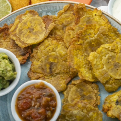 Tostones de plátano, dip de tocineta, queso crema, frijol refrito, pico'e gallo, salsa cheddar, reducción de balsámico y ajonjolí.