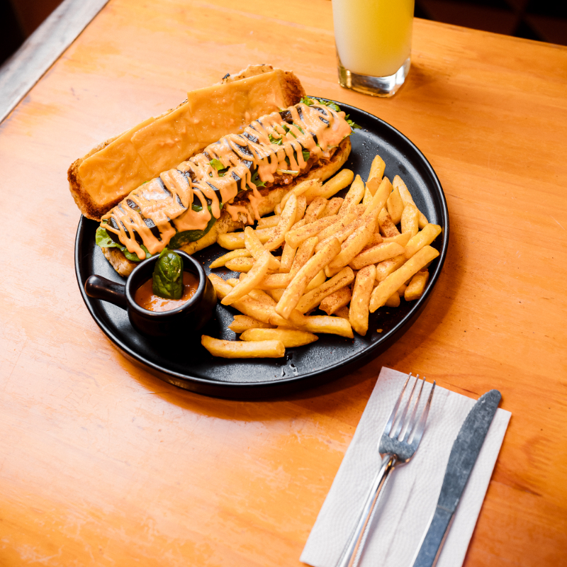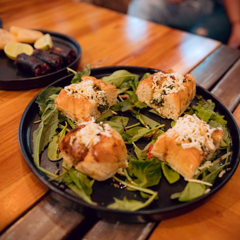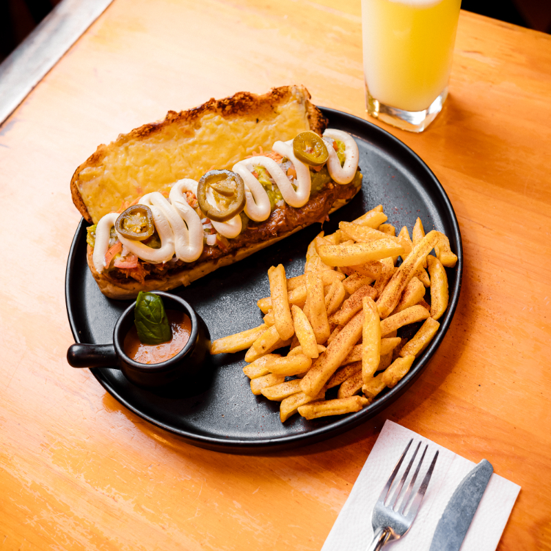 Pan artesanal de orégano y parmesano cortado en 4 partes, mézclum, chorizo de yolombo, chimichurri, balsámico, Queso rallado, y papas a la francesa.