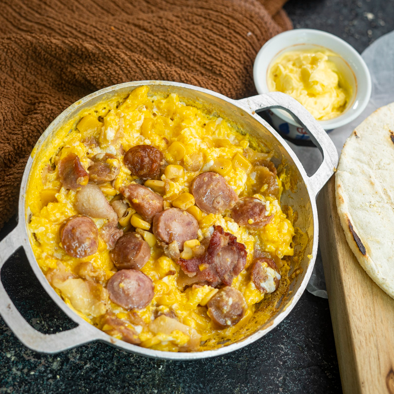 Huevos con tocineta, salchicha y maicitos, acompañados de arepa.