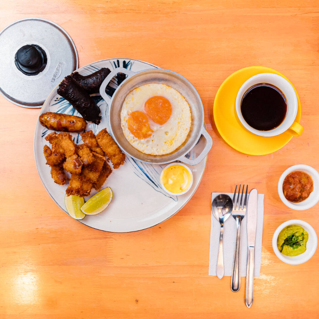Chorizo, morcilla, chicharrón apanado, huevos en cacerola, hogao, guacamole, limón y arepa.