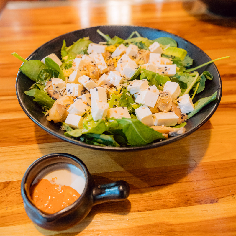 Mezclum fresco, aguacate, champiñones,mix de ajonjoli, quinua soplada, queso fresco, aderezo de crema de leche y pimentones asados.