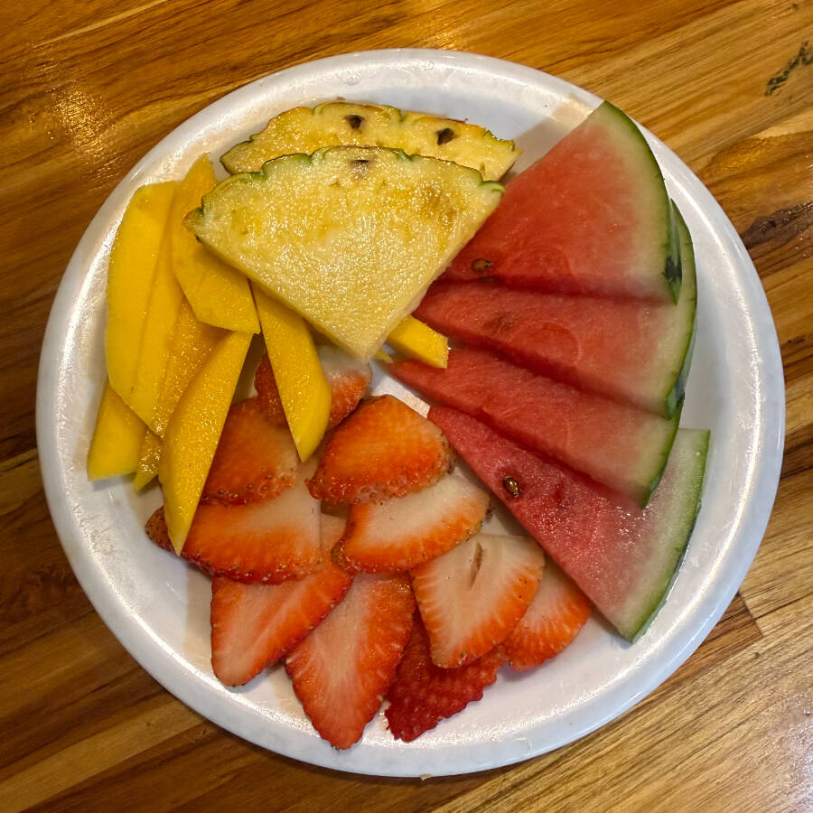 Porción fresca de frutas variadas, aproximadamente 250g, ideal para un desayuno nutritivo.