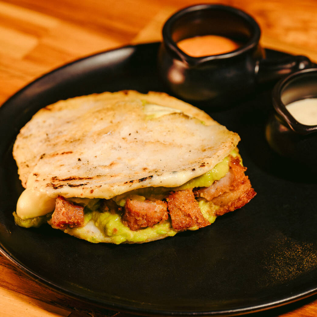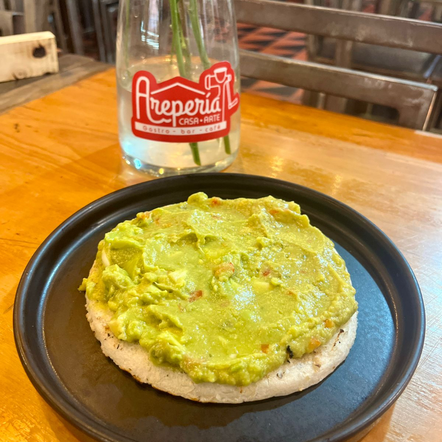 Arepa con guacamole. Elige tu tipo de arepa: de tela, chócolo o patacón.