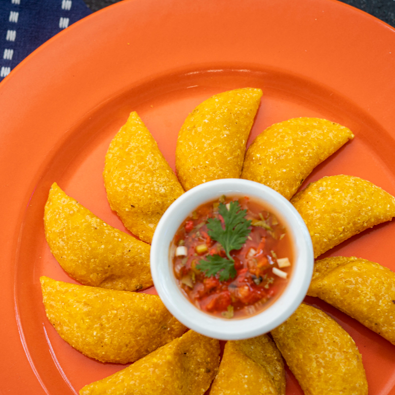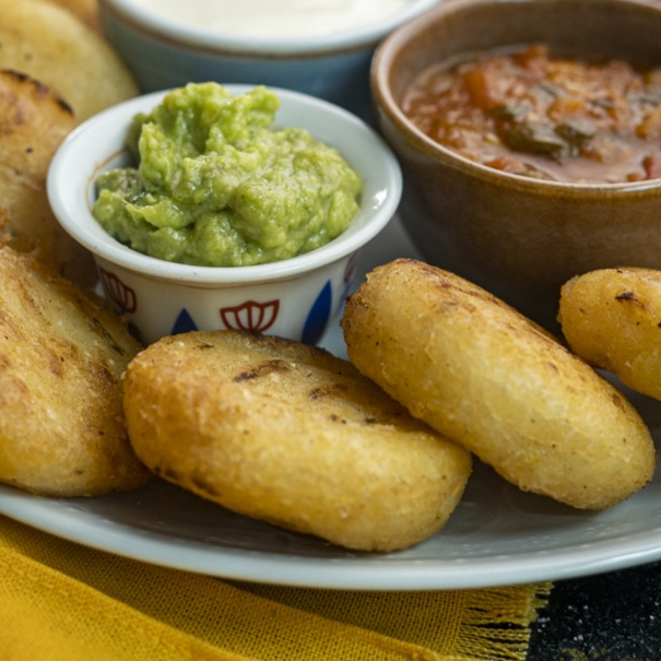 5 unidades de arepitas fritas acompañadas de hogao, guacamole y queso crema.