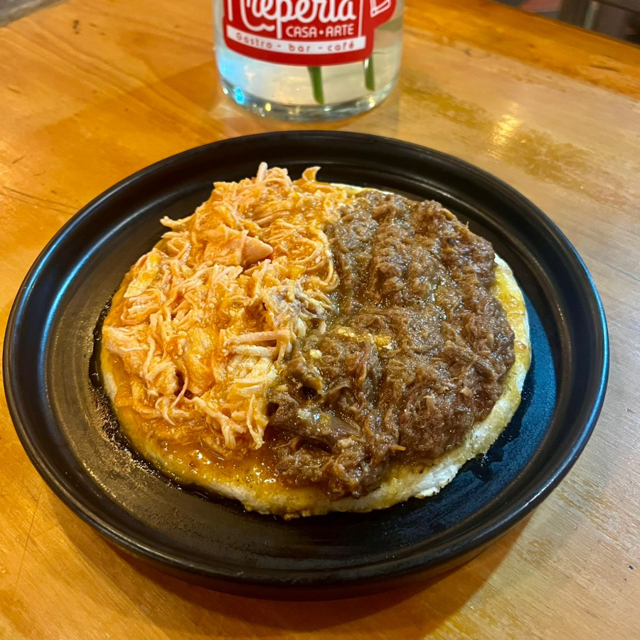 Arepa mixta con carne y pollo desmechados. Elige tu tipo de arepa: de tela, chócolo o patacón.