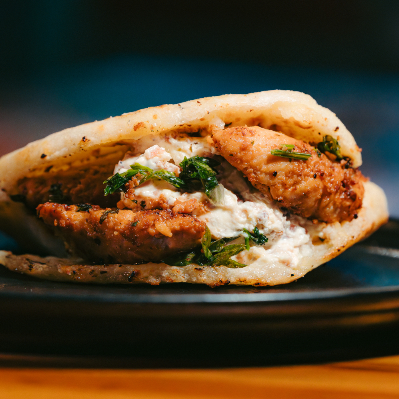 Rellena de mantequilla de vaca, queso, bastones de pechuga parrillada,chimichurri,dip de tocineta