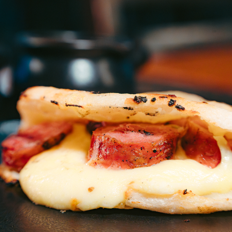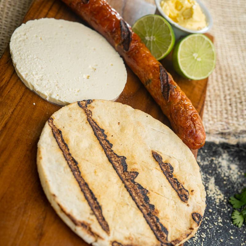 Arepa con chorizo entero y quesito. Elige tu base: arepa de tela, chócolo o patacón.