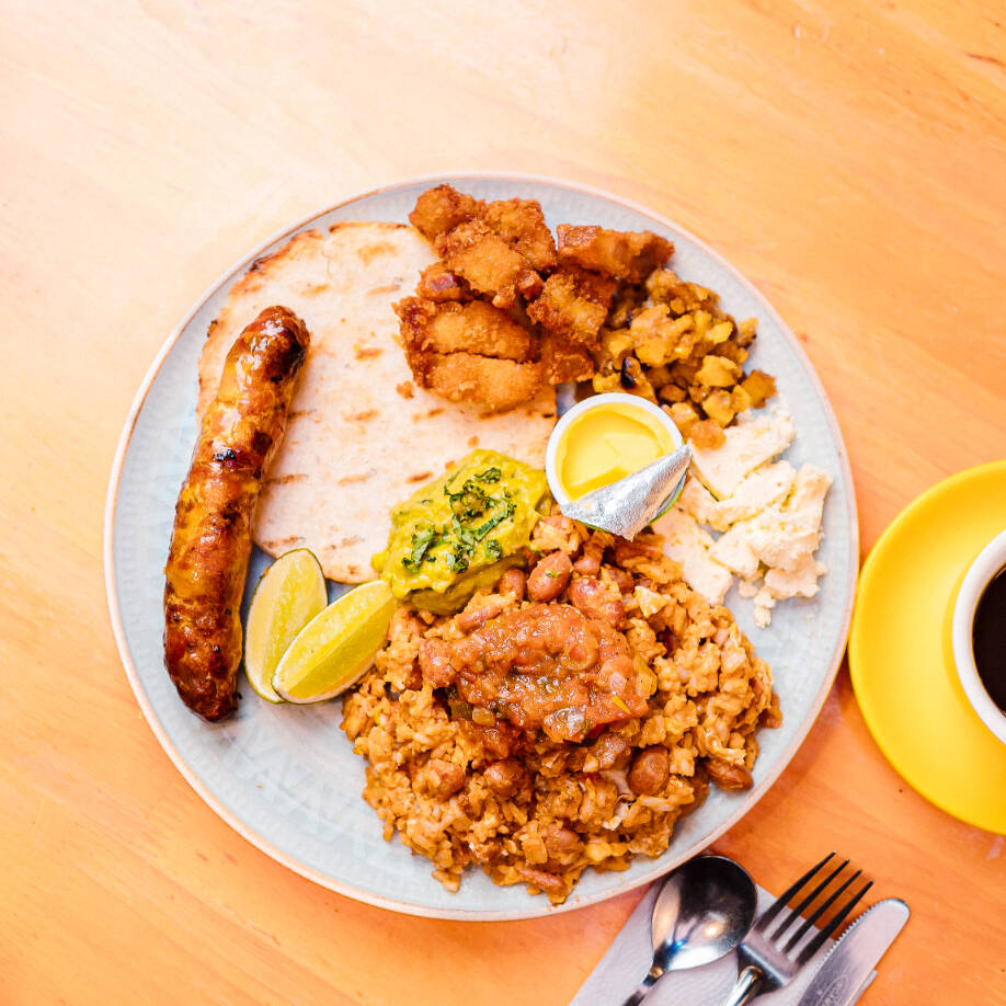 Calentao de frijoles con arroz y huevo revuelto como en la casa de la abuela, acompañado de chorizo santa rosano, chicharrón apanado, quesito, hogao, maduritos en mantequilla, arepa tela, guacamole y limón.