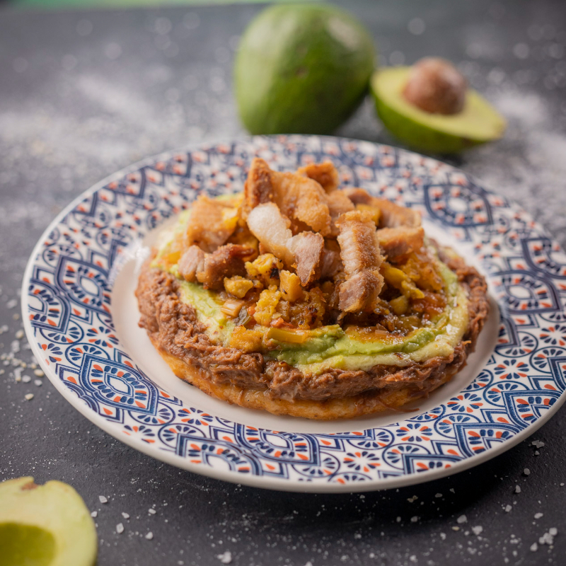 Fríjoles de vereda, chicharrón, chorizo tipo ranchero, trocitos de maduro en mantequilla, hogao, aguacate, carne desmechada, crocante de papa y un toque de cebollín