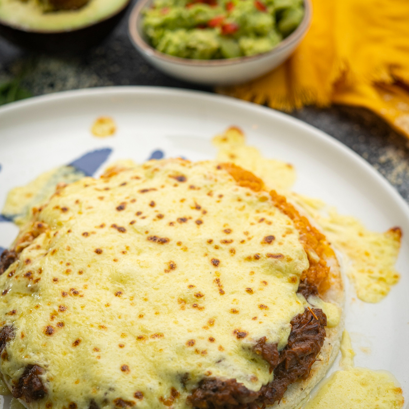 Pollo desmechado en reducción de tomate y mantequilla, carne de res en cocción lenta, guacamole, queso crema y pico'e gallo, si lo quieres bravo viene acompañado de jalapeños y sriracha.