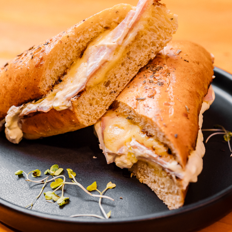 Sánduche con jamón, queso mozzarella y queso crema en pan artesanal de orégano y parmesano.