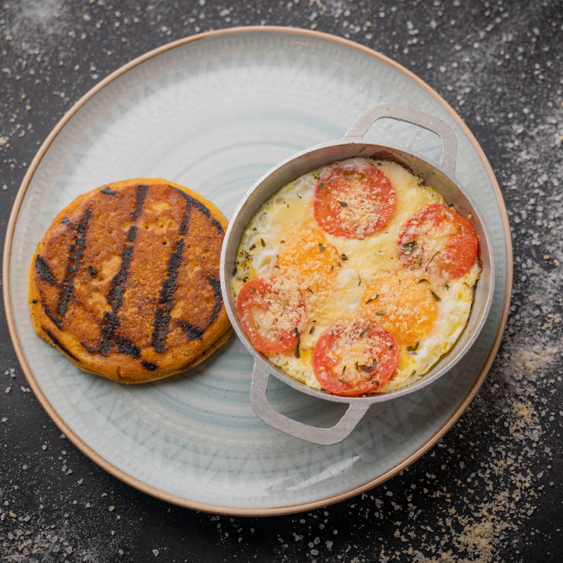 Huevos con tomate confitado, salsa napolitana, albahaca, orégano, mozzarella y parmesano, acompañados de arepa.