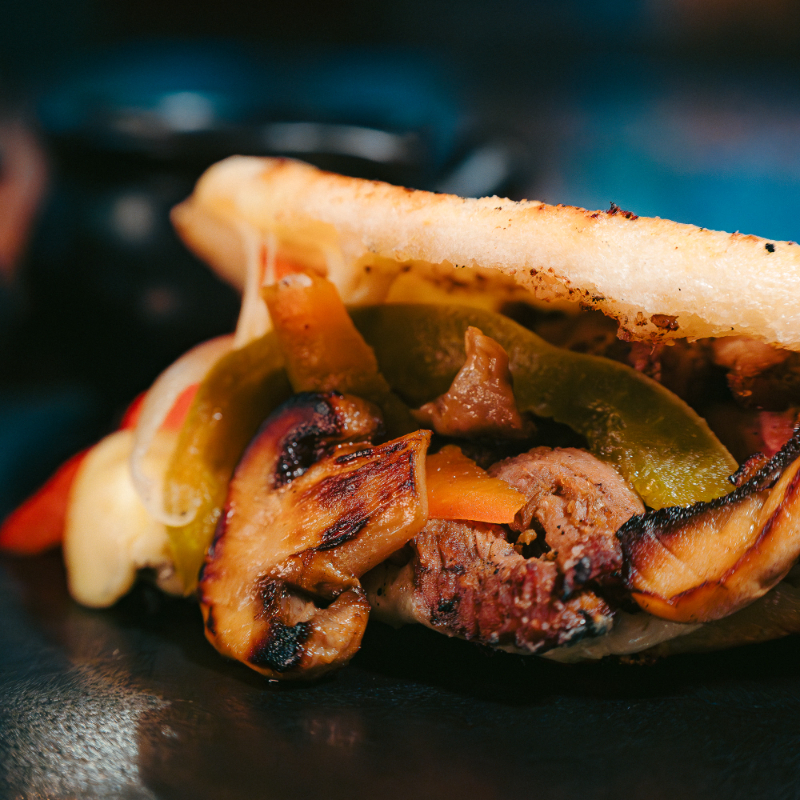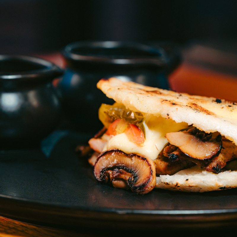 Rellena de mantequilla de vaca, queso, bastones de res parrillada, escabeche de pimentones, cahmpiñones al ajillo.