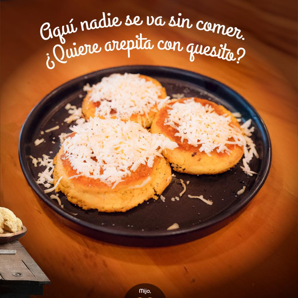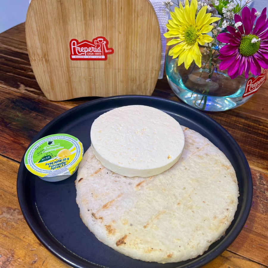 Arepa con quesito. Elige tu tipo de arepa: de tela, chócolo o patacón.