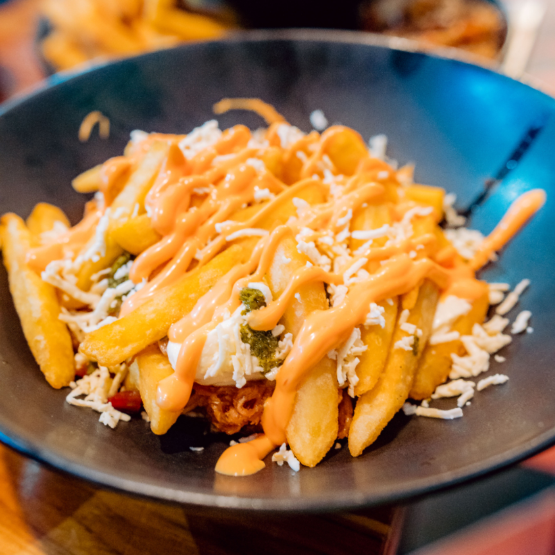 Papas francesas, pulled pork, pico'e gallo, guacamole, queso crema, queso fresco rallado, salsa mayo pimentón y chimichurri.