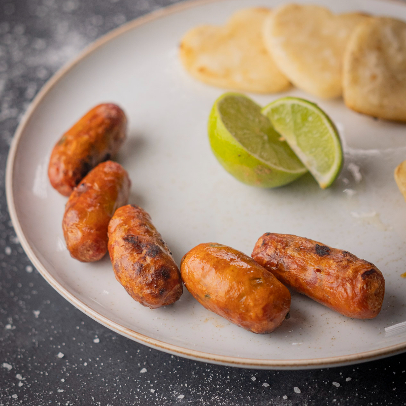 3 choricitos caseros acompañados de 3 arepas y limón.
