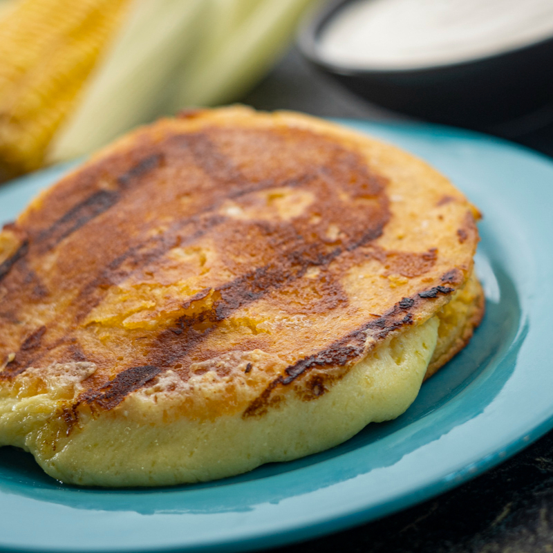 Arepa rellena de queso mozzarella. Elige tu tipo de arepa: de tela, chócolo o patacón.