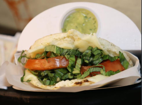 Arepa, mantequilla, doble queso mozarela, albahaca y tomate.