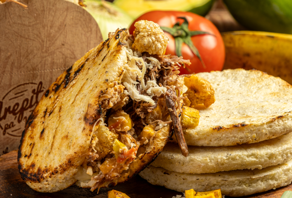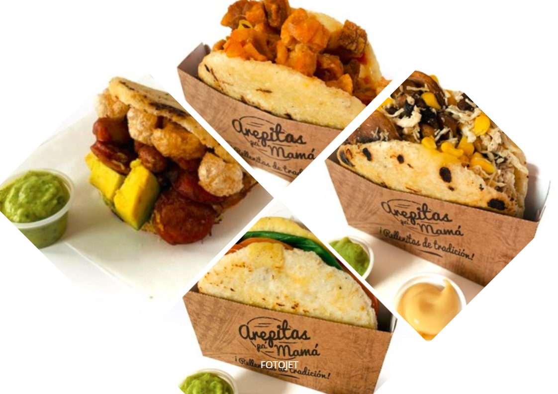 Arepa, mantequilla, queso mozarela, hogao, carne desmechada, pollo desmechado, chicharrón, maduros.