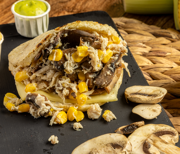 Arepa, mantequilla, queso mozarela, pollo desmechado, maíz tierno y champiñones.