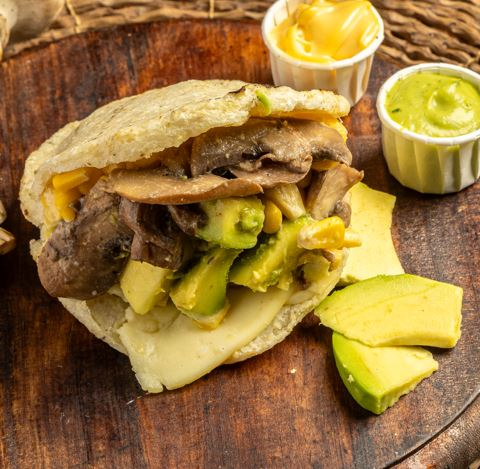 Arepa, mantequilla, queso mozarela, champiñones, maíz tierno y aguacate.
