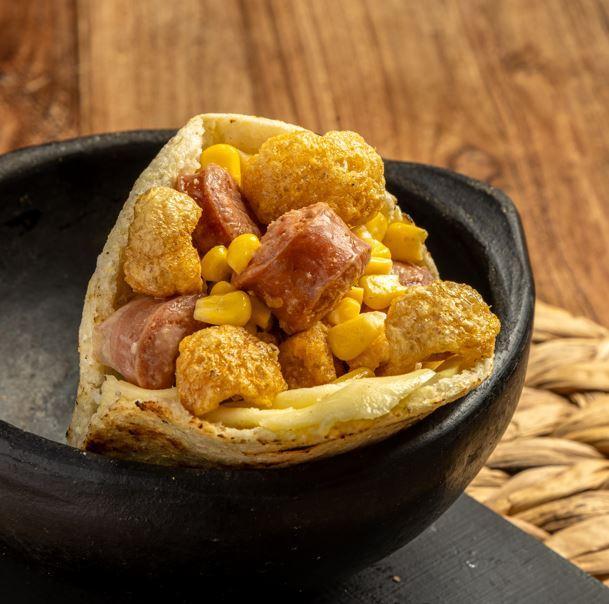 Arepa, mantequilla, queso mozarela, maíz tierno, chicharrón deshidratado y chorizo.