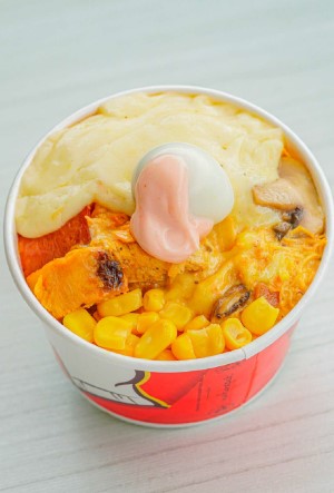 Pollo, champiñón, tocineta, queso y huevo de codorniz.(310g)