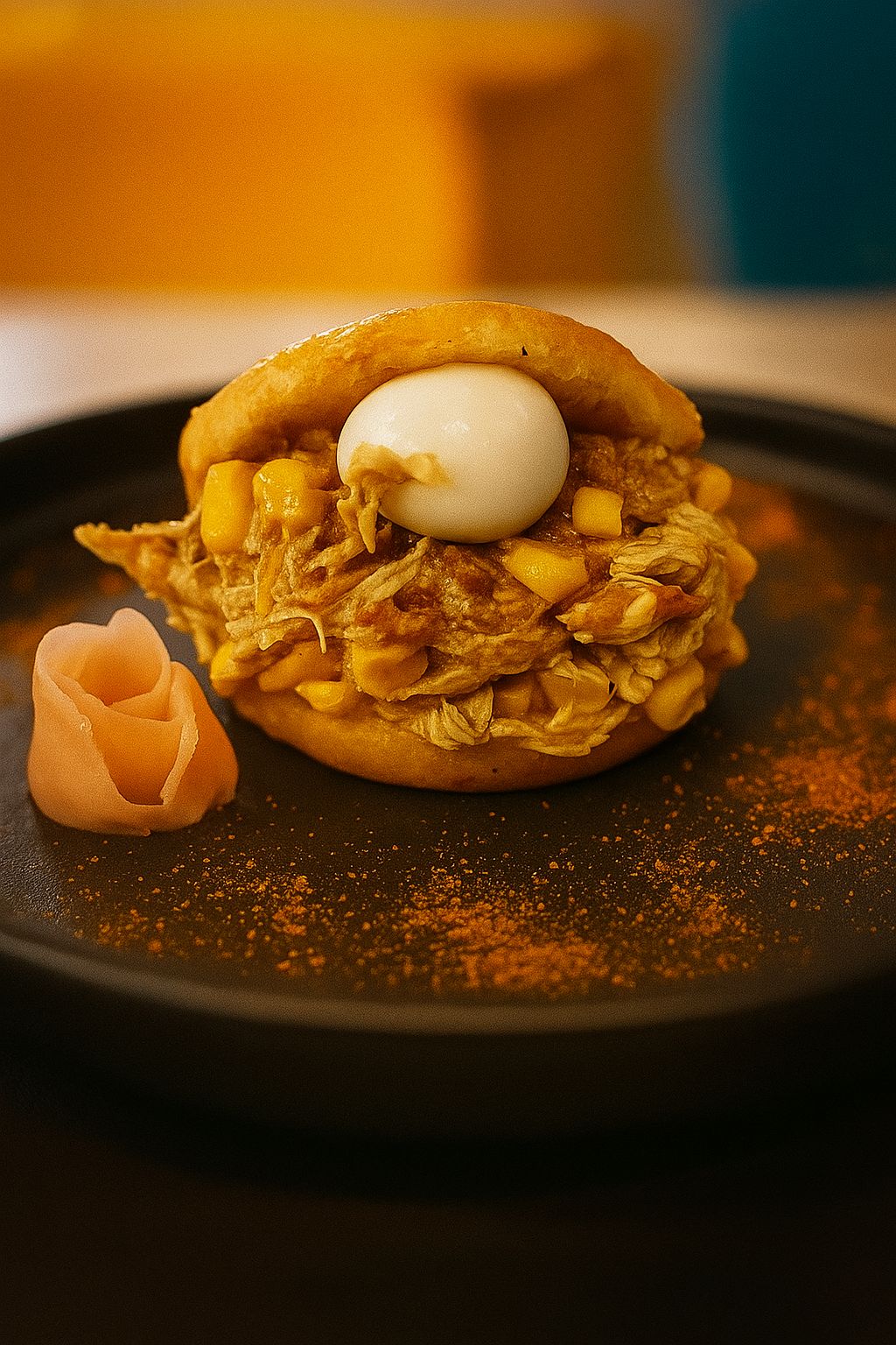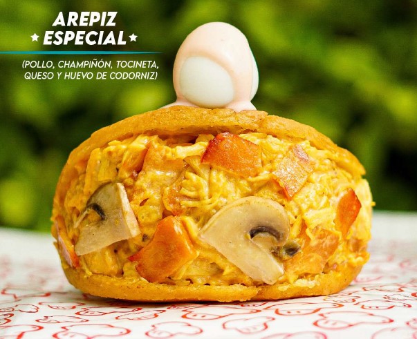 Mini arepa rellena de pollo, maíz dulce, madurito frito, huevo de codorniz y queso!