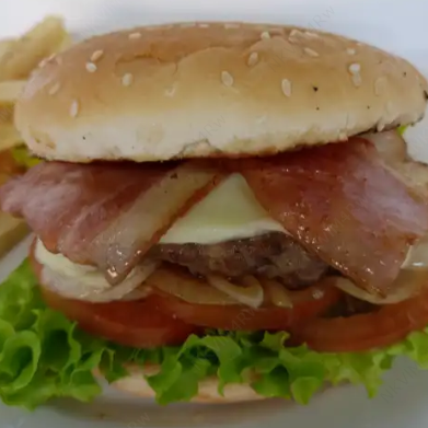 Hamburquesa de res 150grs , con queso tocineta, papas y bebida.