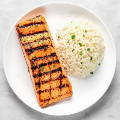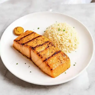 Orden de 250 grs de salmón preparado a la plancha, acompañado de arroz con coco, patacón y ensalada del día