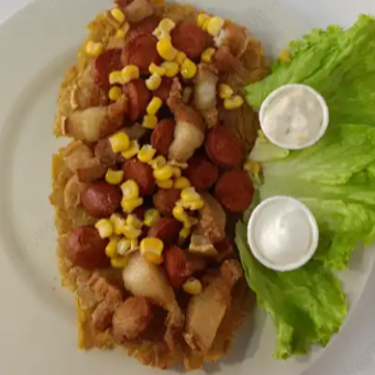 Patacón a elegir con chicharrón, chorizo y maicitos, con salsas y acompañante de la casa