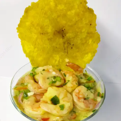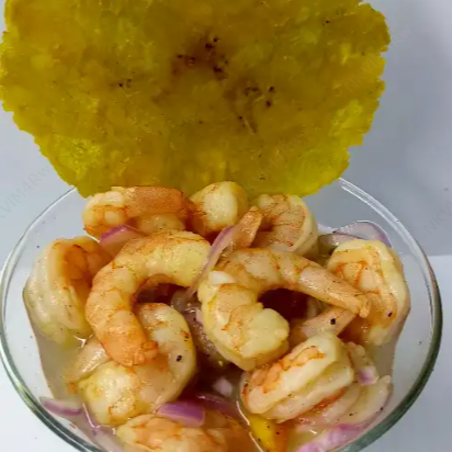 Ceviche de camarón en salsa miel mostaza, con cebolla, limón, sal y pimienta. Incluye un patacón.