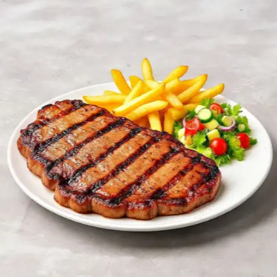Porción de carne churrasco a la plancha acompañada de papas a la francesa y ensalada del día