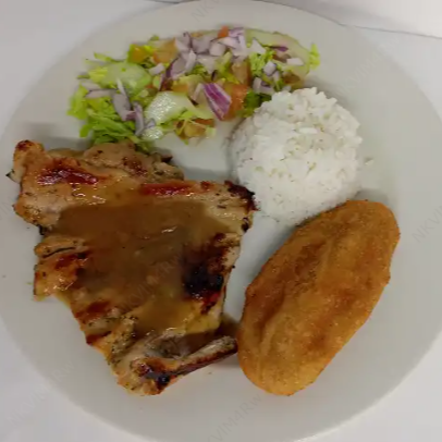 Chuleta de cerdo con salsa BBQ, acompañada de papas a la francesa. Incluye ensalada del día