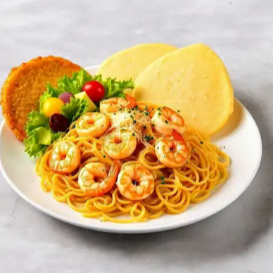 Pasta preparada con camarones, acompañada de ensalada de día, patacon y queso parmesano