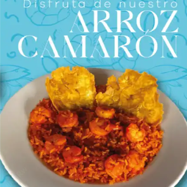 Arroz con camarones y verduras salteadas, con dos patacones y ensalada de la casa.