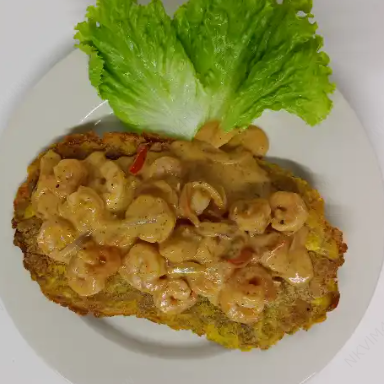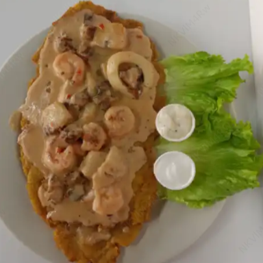 Patacón a elegir cubierto de camarones con salsas y acompañante de la casa.