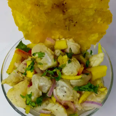 Ceviche con mango, pimentón amarillo, ají amarillo, cebolla, limón y sal, acompañado de camarones o pescado. Incluye una porción de plátano frito.
