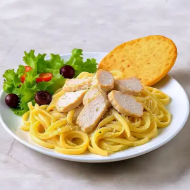 Tallarines en salsa alfredo con pechuga, queso parmesano, ensalada y patacon