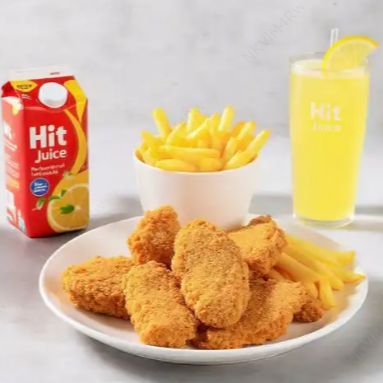 Orden infantil de trozos de pechuga apanados acompañados de papas a la francesa y jugo hit o limonada natural a elegir