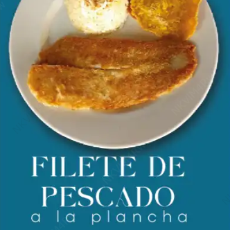 Filete de pescado blanco apanado o a la plancha a elegir, con consomé, patacón, arroz y ensalada del día, acompañado de limonada natural o jugo del día